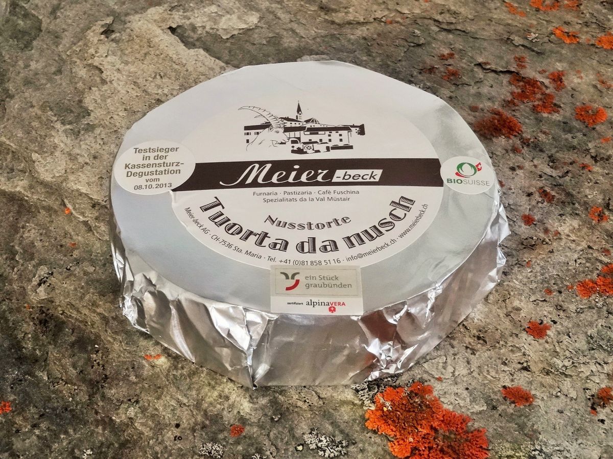 Zutaten: Weissmehl* 23,5% CH Graubünden, Milch* 22,75% CH Val Müstair, Zucker* 22,75% CH/DE, Butter* 13,15% CH Val Müstair, Baumnüsse* 19,05% EU/BG/MD, Rahm* 9,5% CH Val Müstair, Eier* 3,4% CH, Honig* 3.35% CH/BG, Glucosesirup* 0,95% EU, Backpulver* 0,35% EU, Speisesalz 0,2% CH