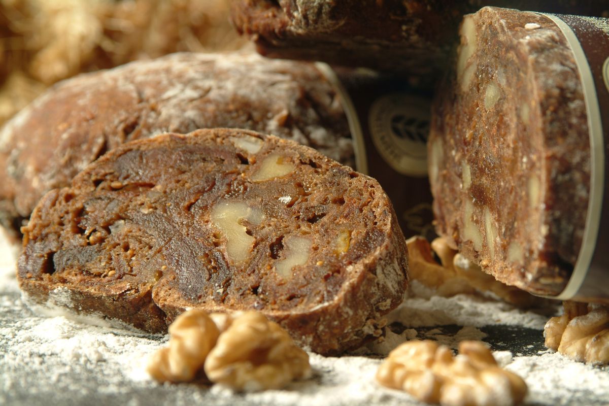 Zutaten: Birnen 27%, Schweizer Urdinkelmehl 18%, Wasser, Feigen, Sultaninen, Baumnüsse, Birnenweggeneinlage 2%, Kernobstbranntwein, Hefe, Birnbrotgewürz, Salz, E-202 (Kaliumsorbat).
