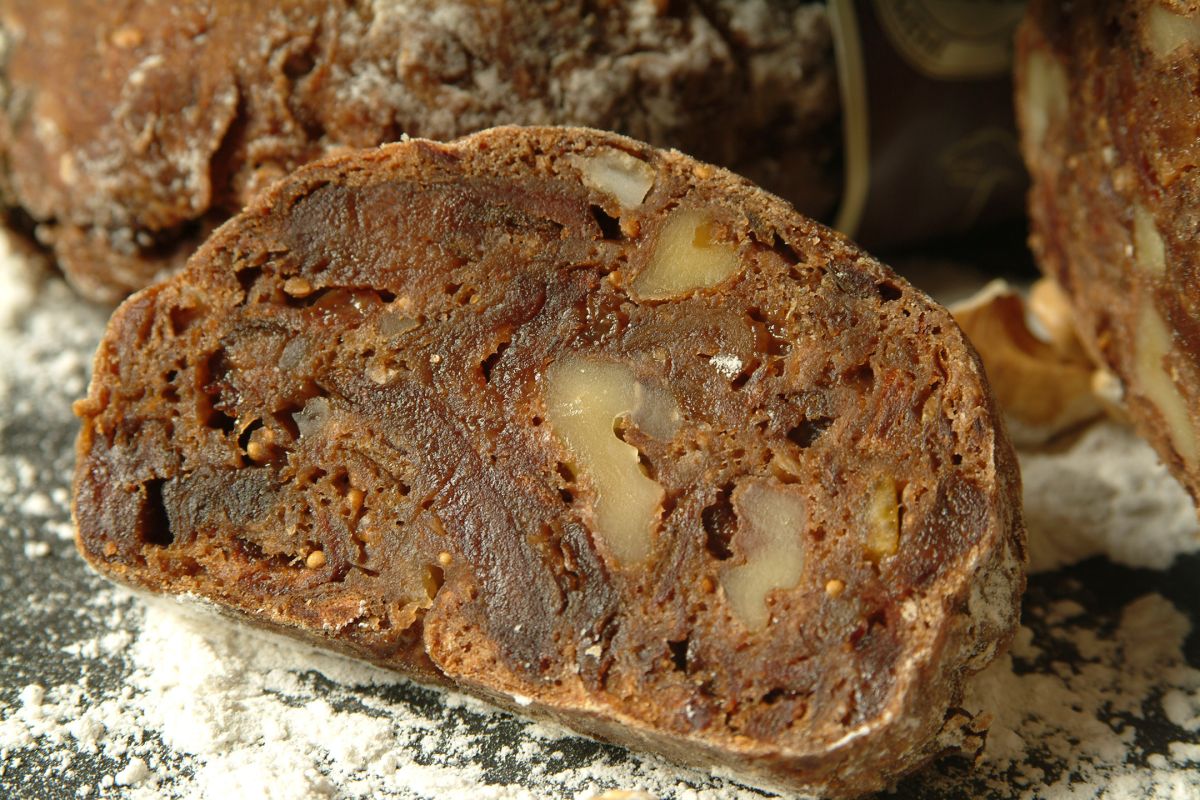 Zutaten: Birnen 27%, Schweizer Urdinkelmehl 18%, Wasser, Feigen, Sultaninen, Baumnüsse, Birnenweggeneinlage 2%, Kernobstbranntwein, Hefe, Birnbrotgewürz, Salz, E-202 (Kaliumsorbat).