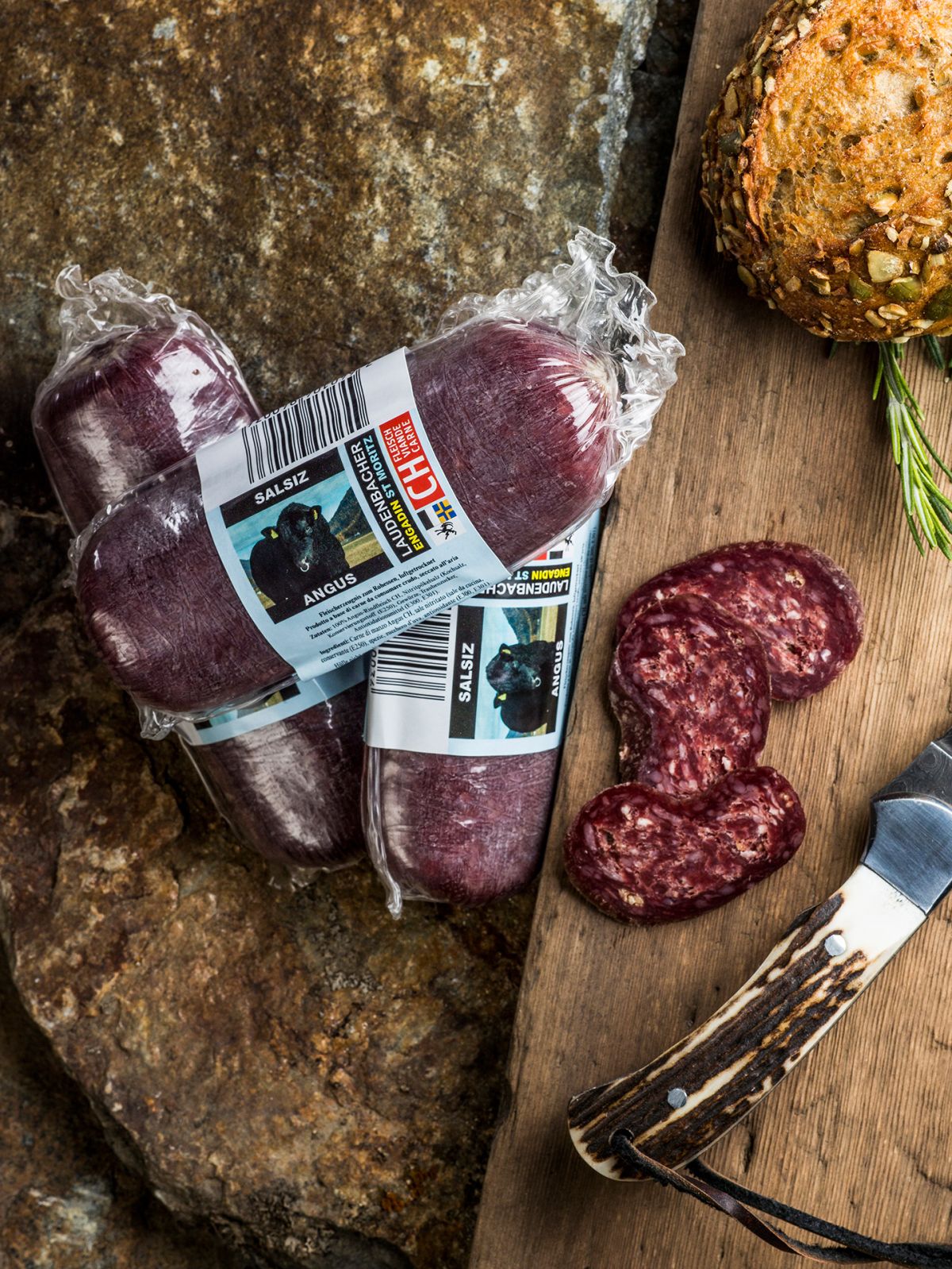 Zutaten: Angus-Rindfleisch CH, Meer-Nitritpökelsalz (Meersalz, Konservierungsstoff Natriumnitrit), Gewürze, Traubenzucker, Antioxidationsmittel Ascorbinsäure (Vitamin C). Hülle zum Verzehr nicht geeignet.