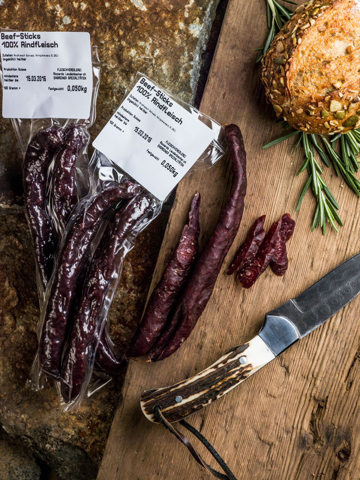 Zutaten: Rindfleisch CH, Wein (enthält Sulfite), Meer-Nitritpökelsalz (Meersalz, Konservierungsstoff Natriumnitrit), Gewürze, Traubenzucker, Antioxidationsmittel Ascorbinsäure (Vitamin C). Hülle zum Verzehr nicht geeignet.