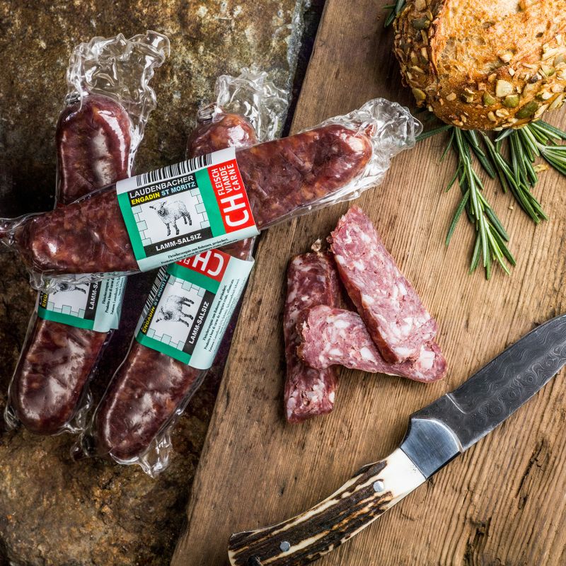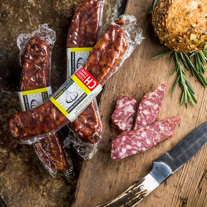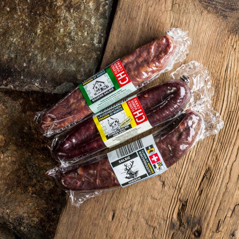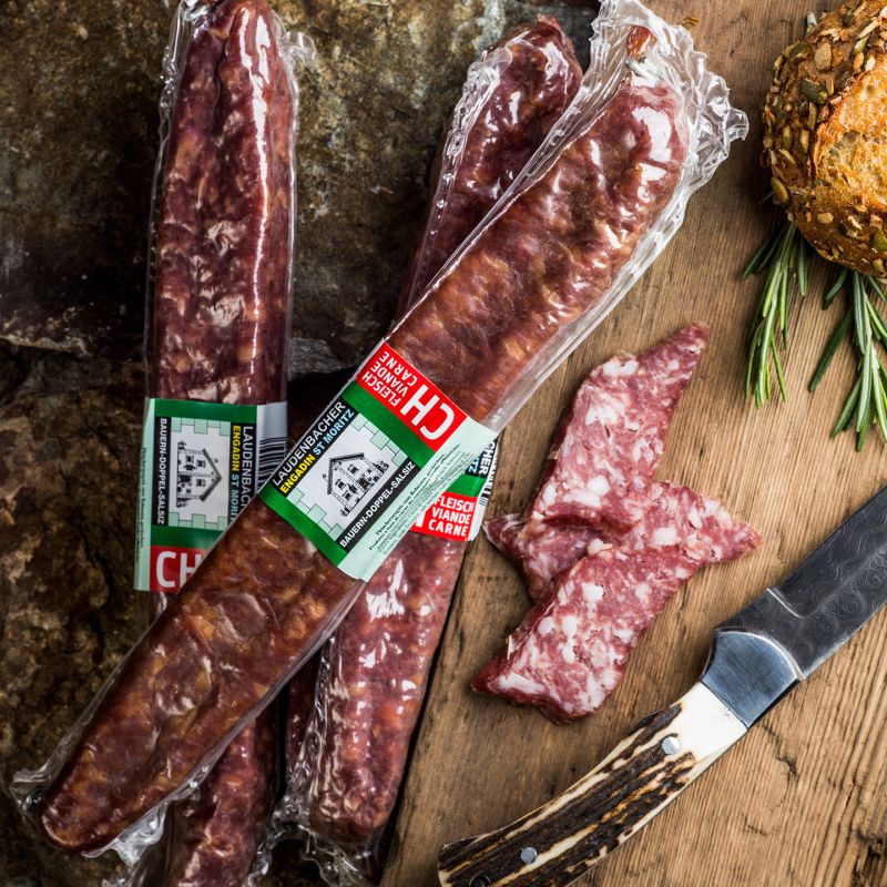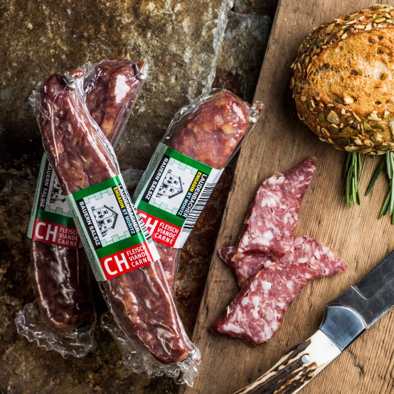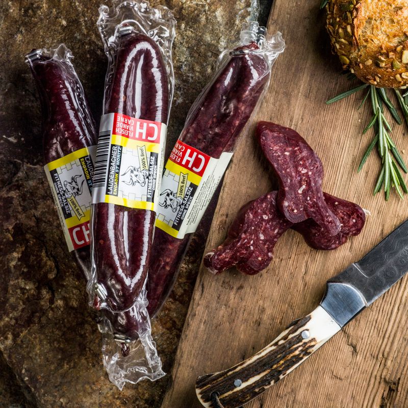 Zutaten: Schweinefleisch CH, Rindfleisch CH, Speck CH, Meer-Nitritpökelsalz (Meersalz, Konservierungsstoff Natriumnitrit), Wein (enthält Sulfite), Gewürze, Traubenzucker, Antioxidationsmittel Ascorbinsäure (Vitamin C). Hülle essbarer Rinderdarm.