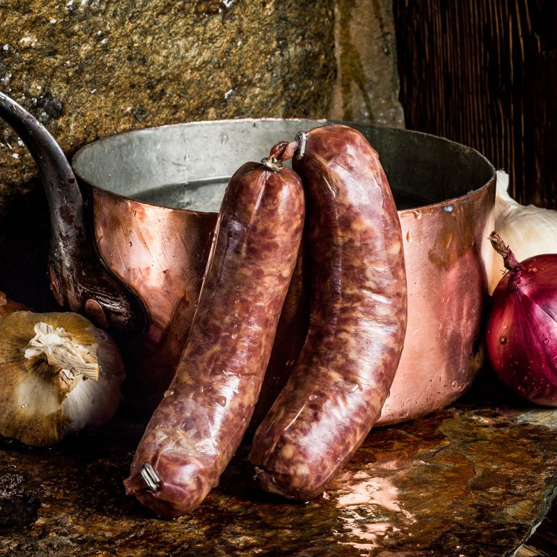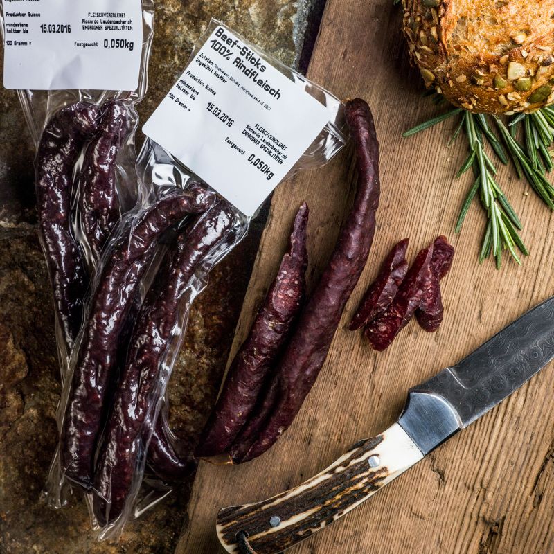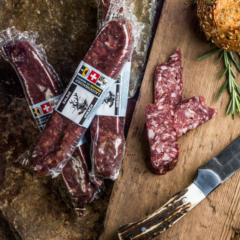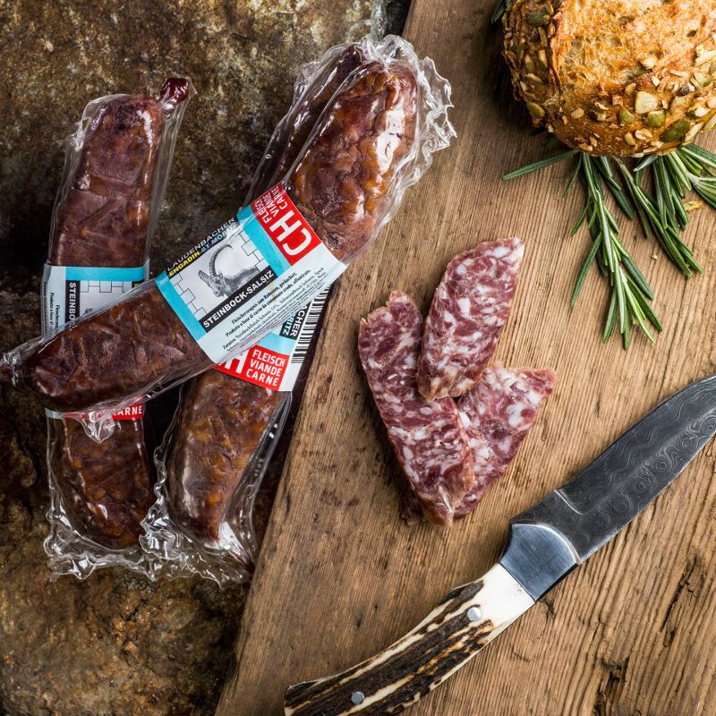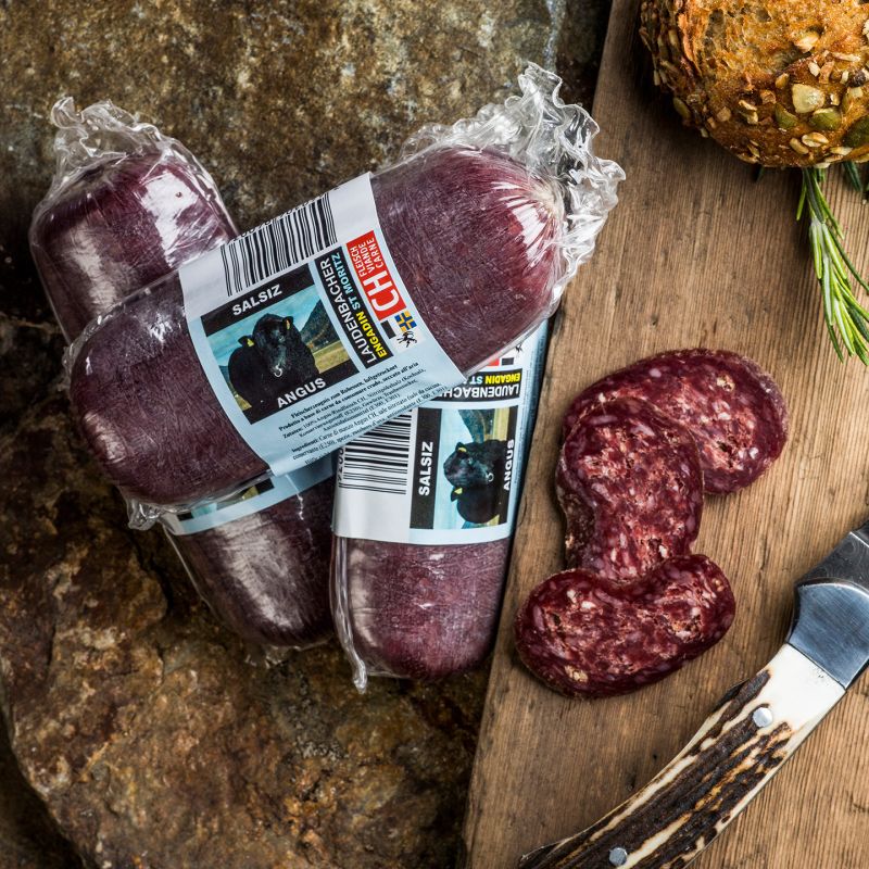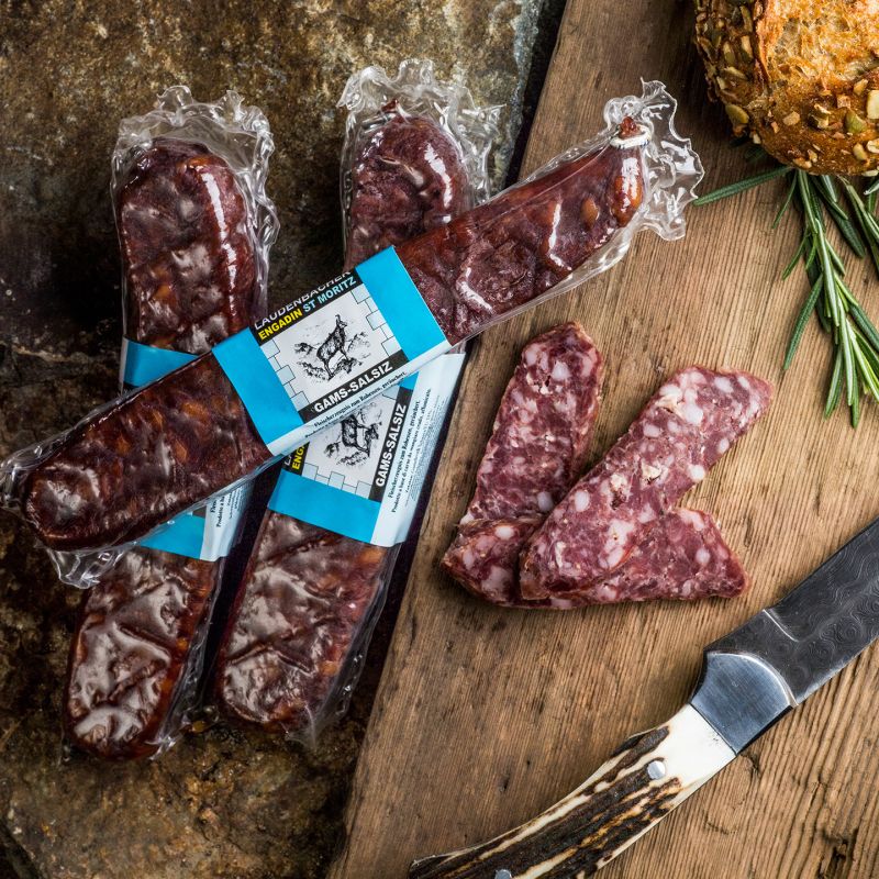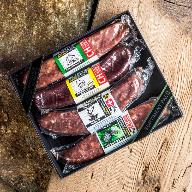 Zutaten: Schweinefleisch CH, Rindfleisch CH, Speck CH, Meer-Nitritpökelsalz (Meersalz, Konservierungsstoff Natriumnitrit), Wein (enthält Sulfite), Gewürze, Traubenzucker, Antioxidationsmittel Ascorbinsäure (Vitamin C). Hülle essbarer Rinderdarm.