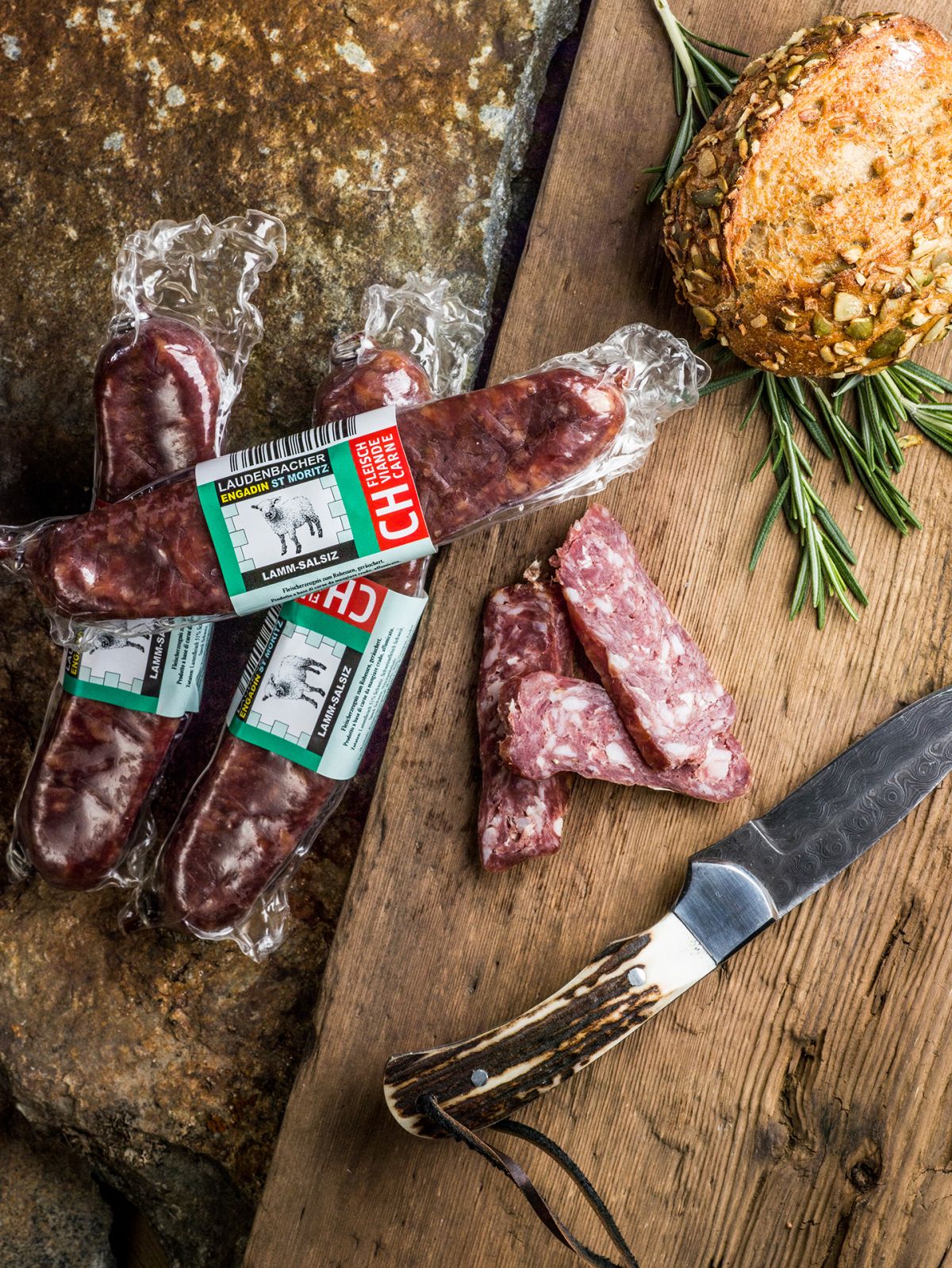 Zutaten: Lammfleisch 53% CH/EU, Schweinefleisch CH, Speck CH, Meer-Nitritpökelsalz (Meersalz, Konservierungsstoff Natriumnitrit), Gewürze, Traubenzucker, Antioxidationsmittel Ascorbinsäure (Vitamin C). Hülle zum Verzehr nicht geeignet.