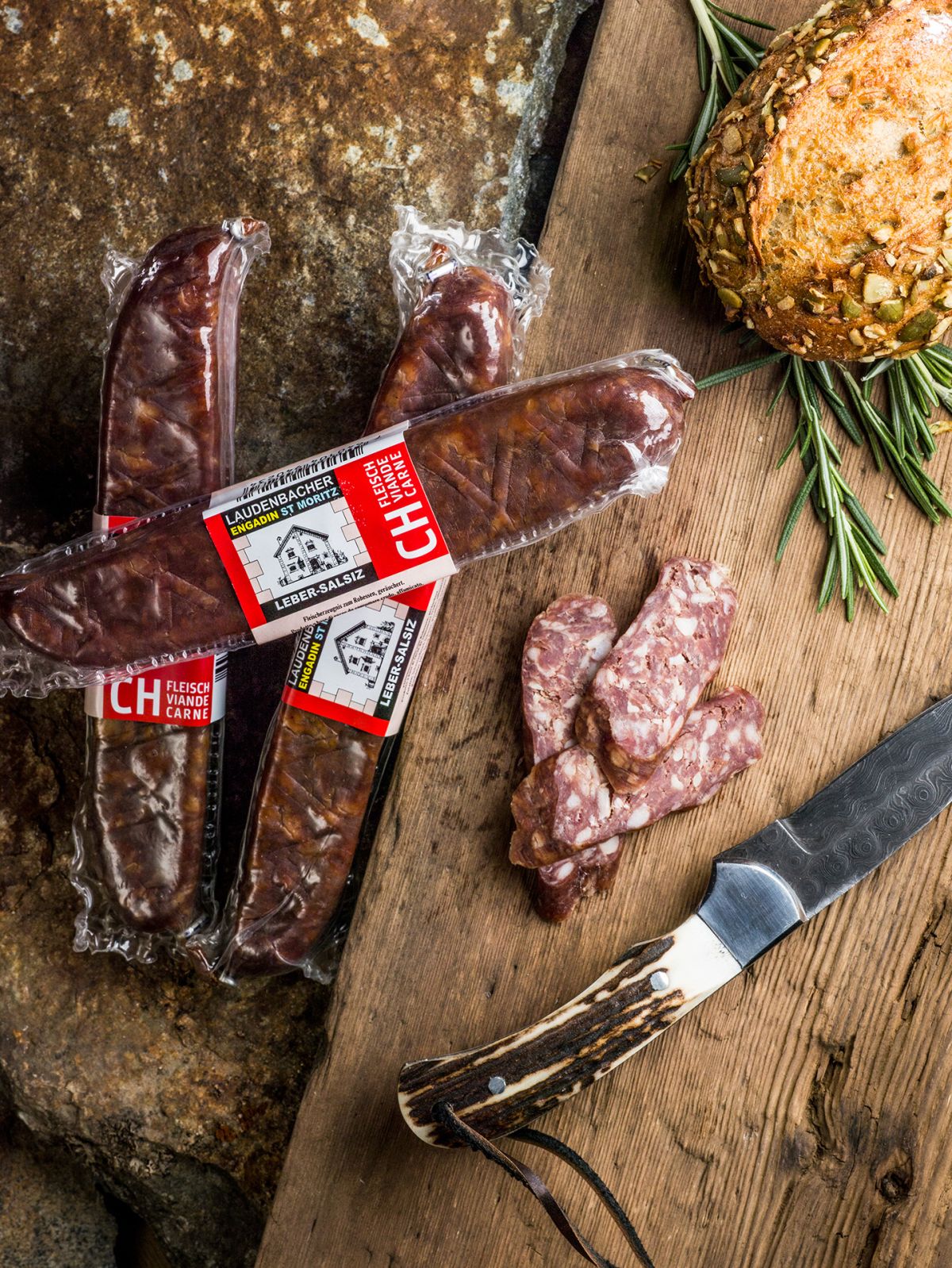 Zutaten: Schweinefleisch CH, Rindfleisch CH, Rindsleber 10% CH, Speck CH, Meer-Nitritpökelsalz (Meersalz, Konservierungsstoff Natriumnitrit), Gewürze, Traubenzucker, Antioxidationsmittel Ascorbinsäure (Vitamin C). Hülle zum Verzehr nicht geeignet.