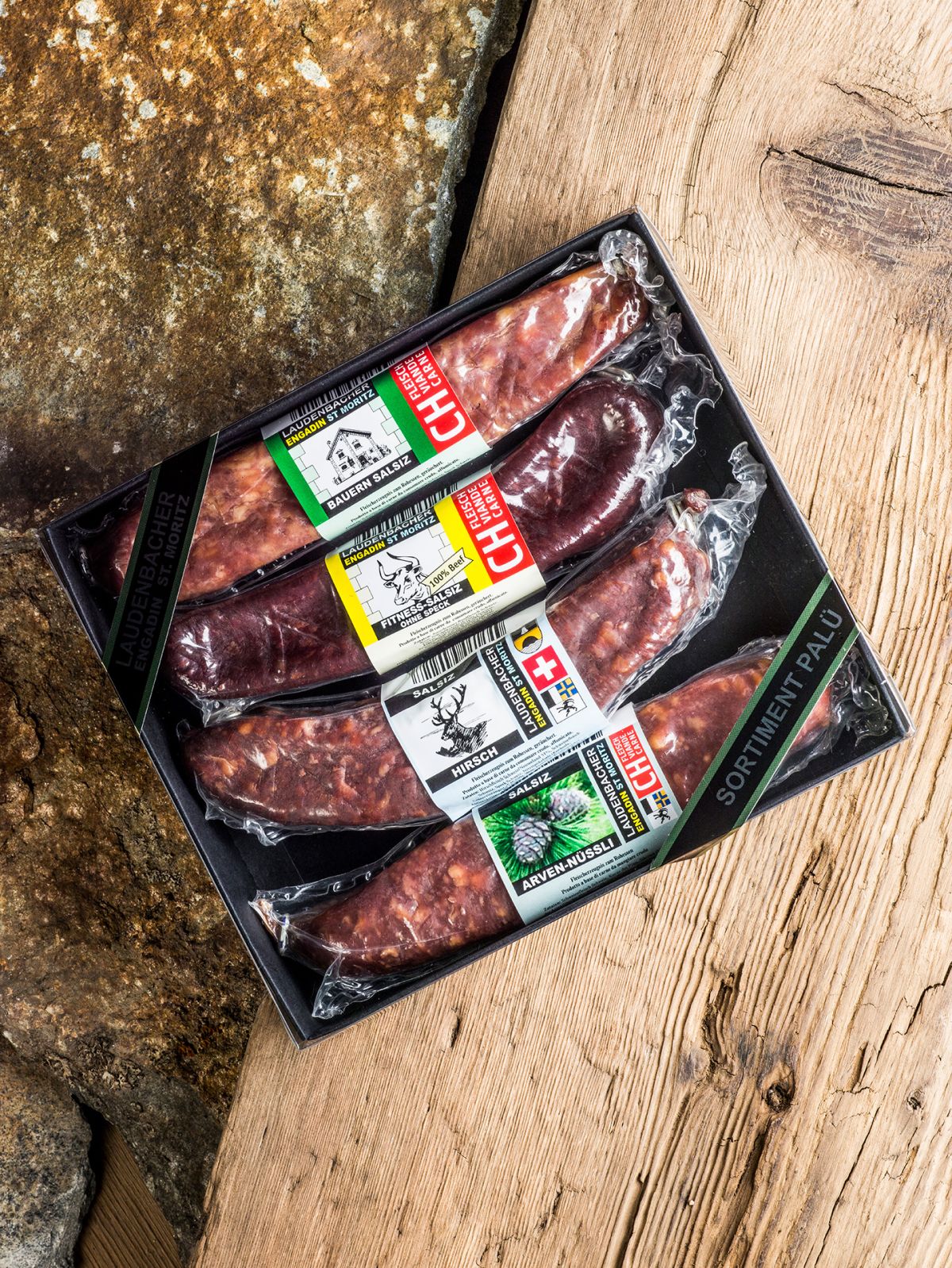 Zutaten (Arven-Nüssli Salsiz): Schweinefleisch CH, Kerne des Pinus Sibirica (Varietät der Arve) Sibirien 4%, Speck CH, Meer-Nitritpökelsalz (Meersalz, Konservierungsstoff Natriumnitrit), Gewürze, Traubenzucker, Antioxidationsmittel Ascorbinsäure (Vitamin C). Hülle zum Verzehr nicht geeignet.